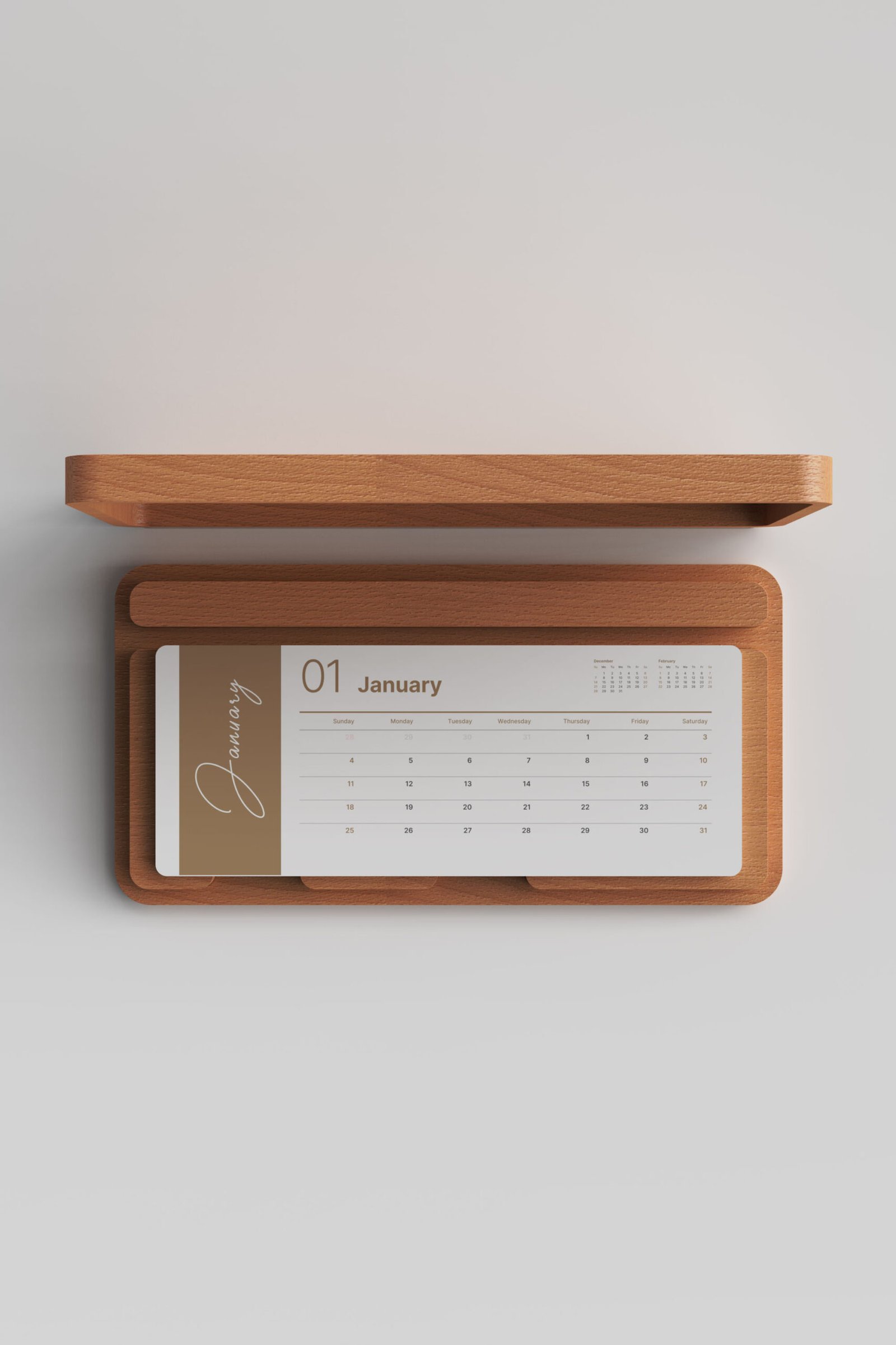 KT-02 Ahşap Masa Takvimi, sade ve şık tasarımıyla her ortamda uyumlu bir kullanım sunar. 18mm kalınlığında ahşap taşıyıcı üzerine yerleştirilen 12 yaprak ve 1 kapaktan oluşan standart takvim, yıl boyunca düzenli ve konforlu kullanım sağlar. Minimalist çizgileri sayesinde bu ahşap masa takvimi, hem kişisel masalarda hem de kurumsal alanlarda estetik bir çözüm oluşturur.